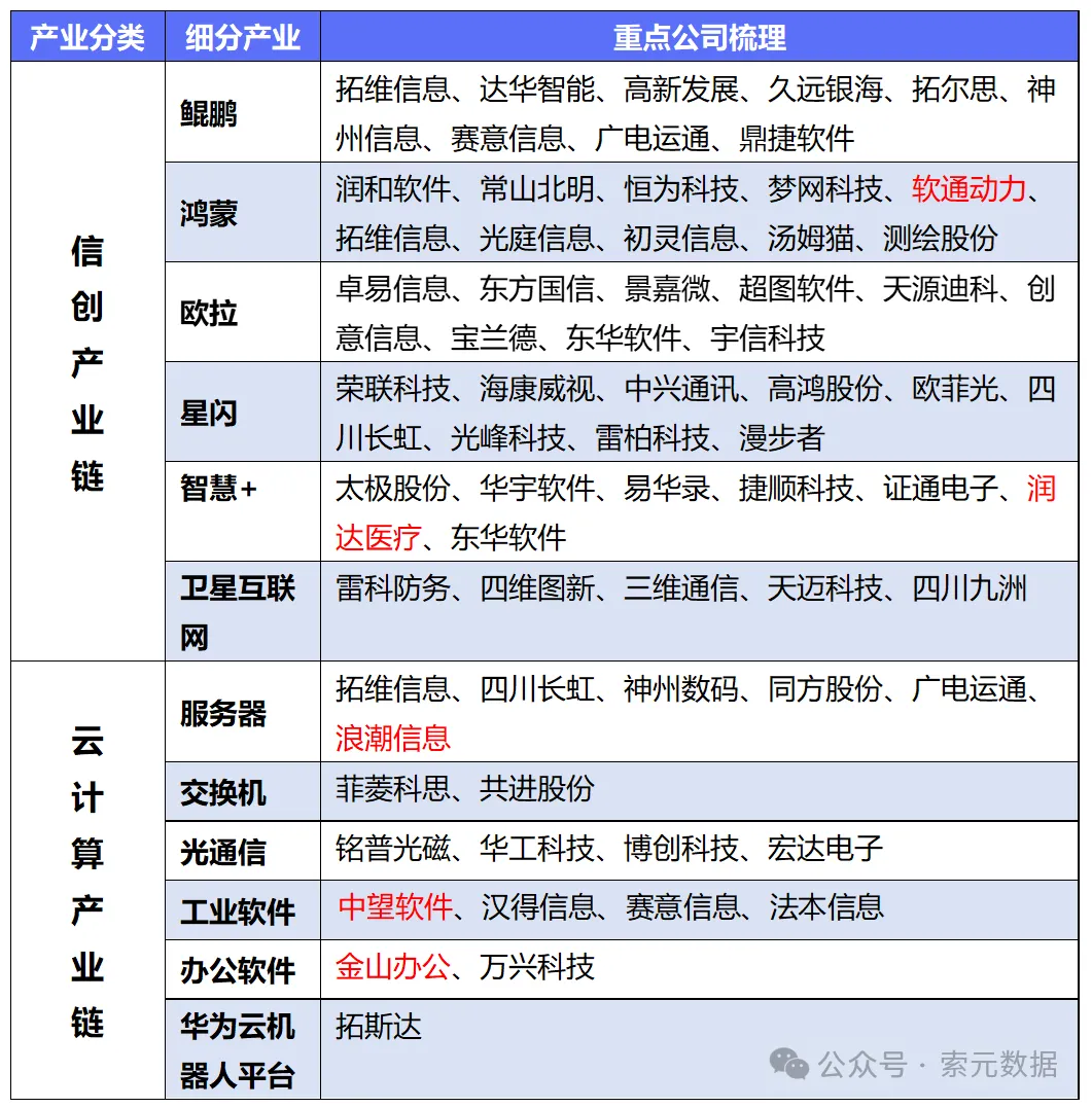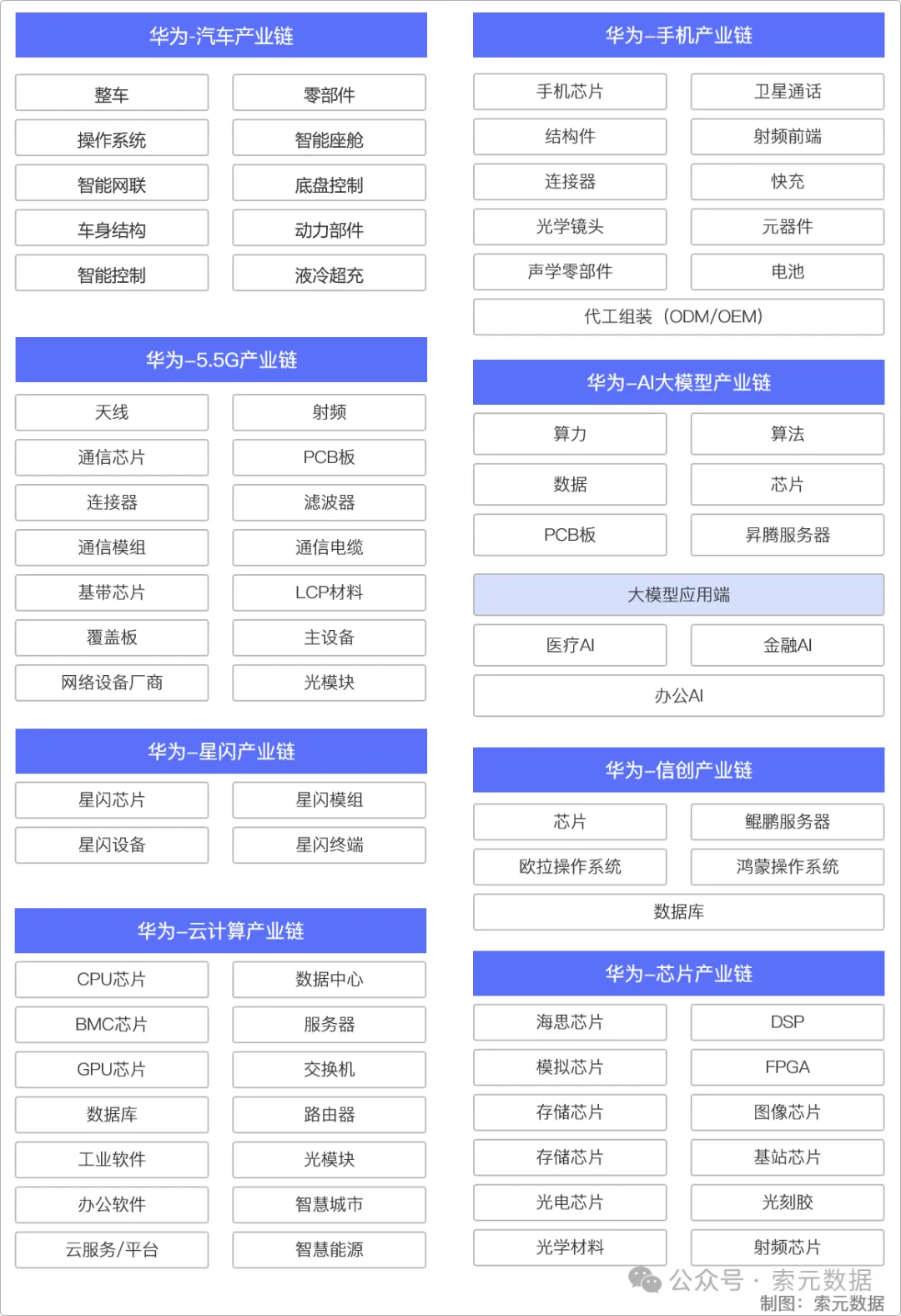 根据市场分析机构Canalys公布的数据,华为在全球高端市场的排名已经来到第三位,增长率达到了80%,排名前三的品牌分别是苹果、三星以及华为。 华为作为我国最强的研发型科技巨头,布局了消费电子(核心是手机)产业、智能汽车、AI盘古大模型、5G/5.5G通信、星闪、信创产业、云计算、华为芯片等,布局广泛且深入,核心的环节拆解图如下所示:
